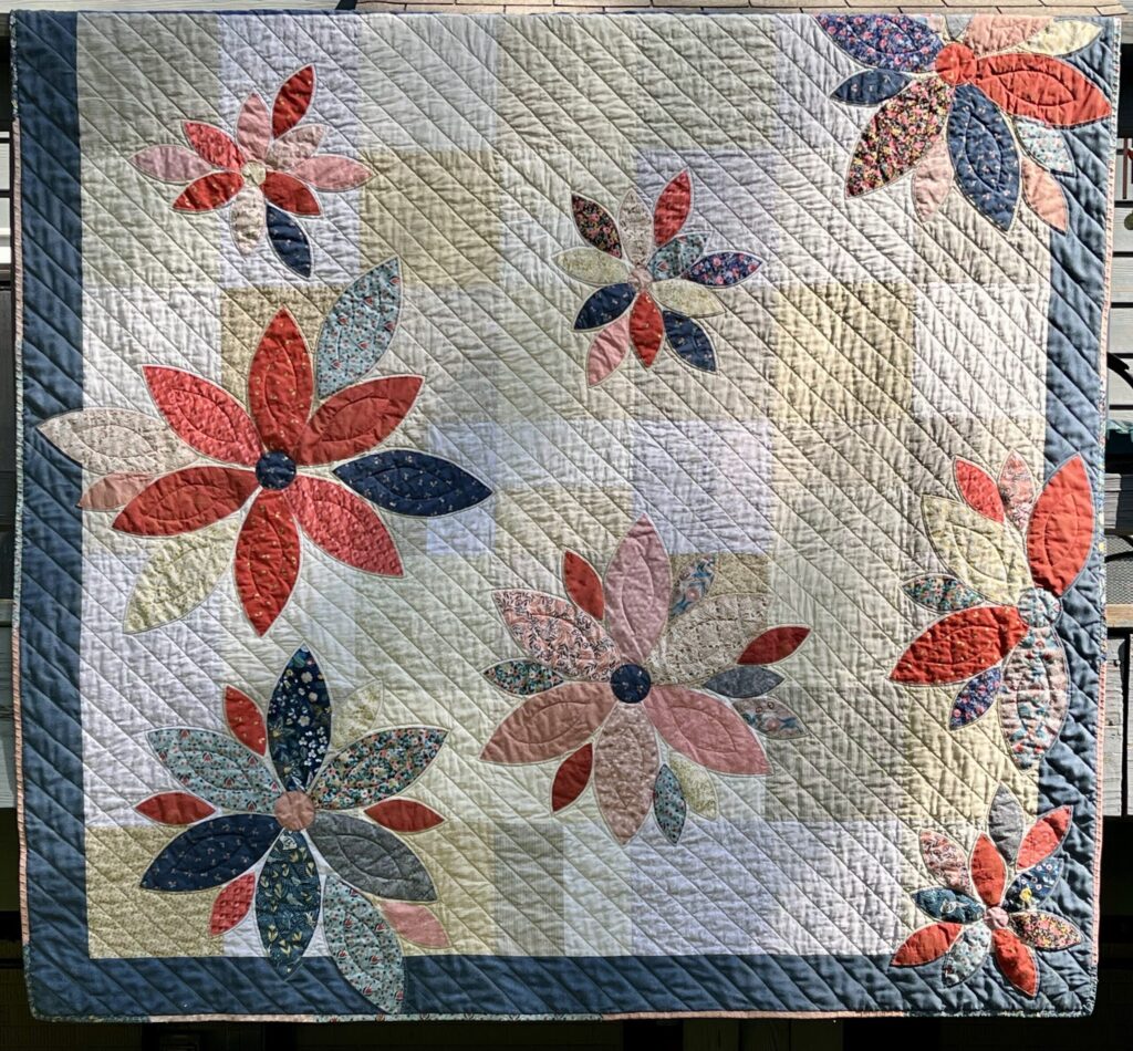 Summer 2025: In the Summer of 2025, my mom and I attended the Mid Appalachian Quilters Symposium in Gettysburg, PA. Wanting to stretch our quilting skills, we took the “Scrap Petal Garden” class with Evelyn Weaver. Using the Scrap Petal Garden pattern by Cabin in the Woods Quilts, along with handy templates for cutting out petals, I cut out the small and large flower shapes and arranged them on a subtle background of large rectangles and squares in muted shades. I added a navy border and allowed my petals (orange, blue, pink, and gold) to explode beyond the border. Back home, I finished appliqueing the petals and then quilted a mix of petal outlines and diagonal lines. This large square quilt was gifted to my neighbor’s mom.